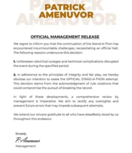The management said to ensure complete adherence to the principles of integrity and fair play, it became imperative to “cease the official Stand-a-thon attempt”.
